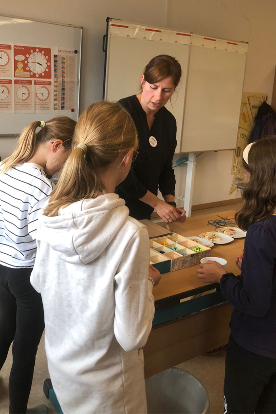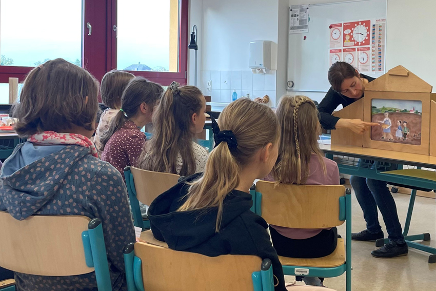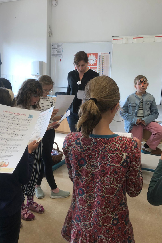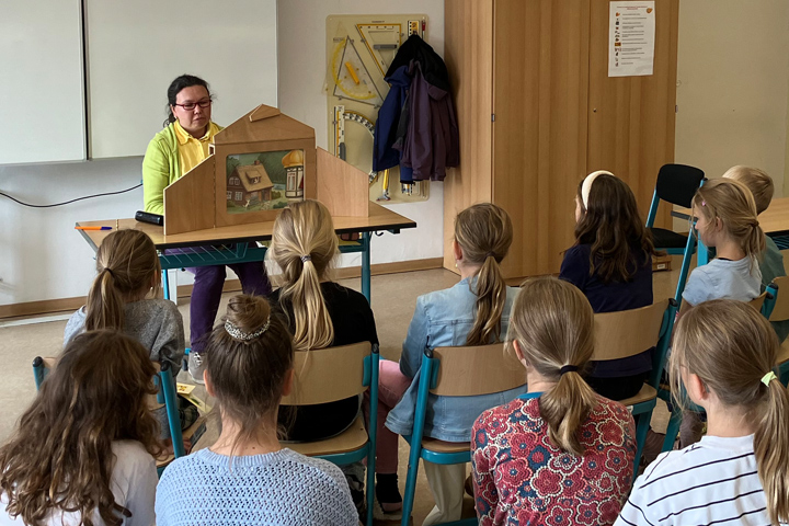 Naša projektowa sobudźěłaćerka Weronika Butendeichowa předstaji w prěnim přeběhu z pomocu kamishibai (powědarske dźiwadło) připołdnicu. W powěsći powěda holca, kak su ludźo w dawnych časach len předźěłali. Tuž wobhladachu sej šulerjo 2. do 4. lětnika symješka, kotrež w suchej hłójčce lenoweje rostliny tča. Woni zeznachu wšelake lane produkty a naměšachu sej z Łužiskeho laneho wolija słódny twaroh. Nimo toho zahrachu rěčne hry ze słowami, kotrež so w powěsći jewjachu, a zaspěwachu nowy spěw „Lutki maja wulku party“ wot Fabiana Kaulfürsta. W druhim a třećim přeběhu stejachu lutki a zmij w srjedźišću. Stawiznje wo nimaj přednošowaše Saule Ruddigkeitowa, kotraž je wobdźělnica DOMOJ-projekta a swój praktikum pola nas w Rěčnym centrumje WITAJ absolwuje. Na to spaslichu sej šulerjo z pisanych a pismikowych parličkow wěšatko za kluč.
