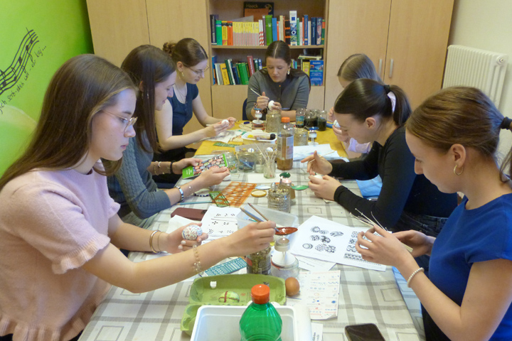 W internatnej jutrownej dźěłarni njesedźa jenož šulerki, ale tež někotři šulerjo. Tam pilnje jejka wóskuja. Někotři su při tym jara wušikni. Je widźeć, zo tutu tradiciju tež doma haja. Druzy dopomnja so na swój čas w horće a tamne prěnje pospyty. Nětko za ze wšěmi utensilijemi přihotowanym blidom a w dobrej atmosferje pozabyte zamóžnosće znowa wotkryja. Mjez sobu sej šulerjo pomhaja a rady dawaja. Tole je to rjane na internaće, zo su w skupinje a zo móža so mjez sobu pohonjować. Raz je žiwe diskutowanje abo smjeće w rumje, raz wšitcy ćicho a koncentrowani swoje třiróžki a smužki na jejko sadźeja. Druhdy pak tež šulerka sama sedźi a meditatiwnje wóskuje.